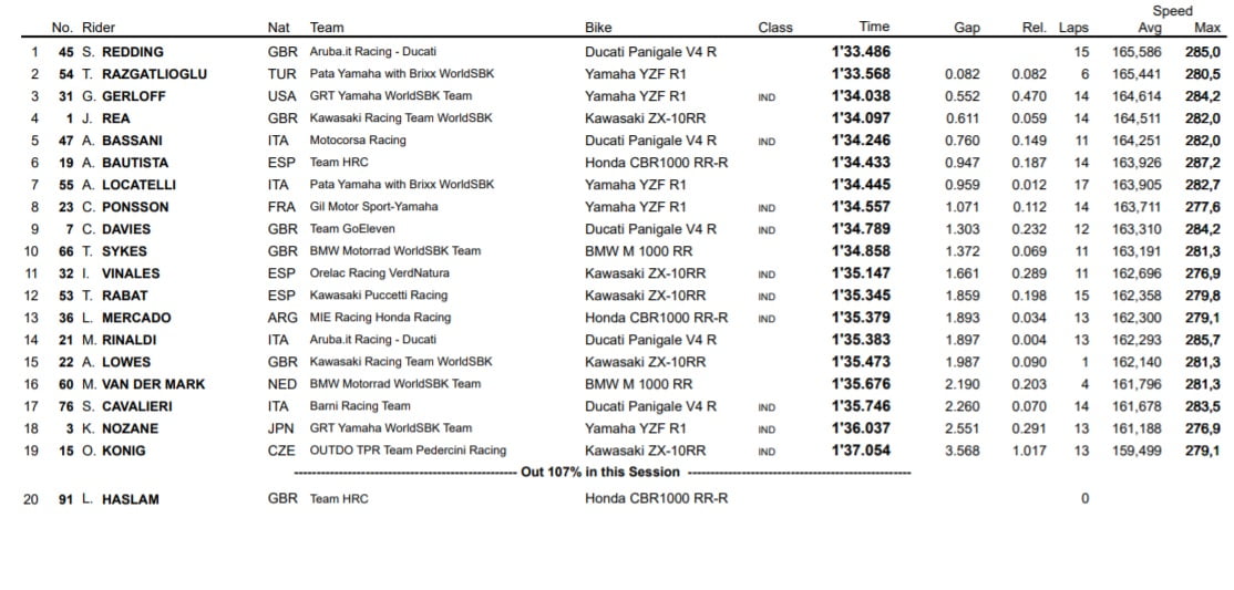 Si cette amélioration en a appelé d’autres, le pilote Ducati a réussi à se maintenir en tête de la feuille des temps, tenant ainsi la dragée haute à Razgatlıoğlu, deuxième de la séance à 82 millièmes. Gerloff a quant à lui bouclé ces FP3 en troisième position, devant Rea et Bassani