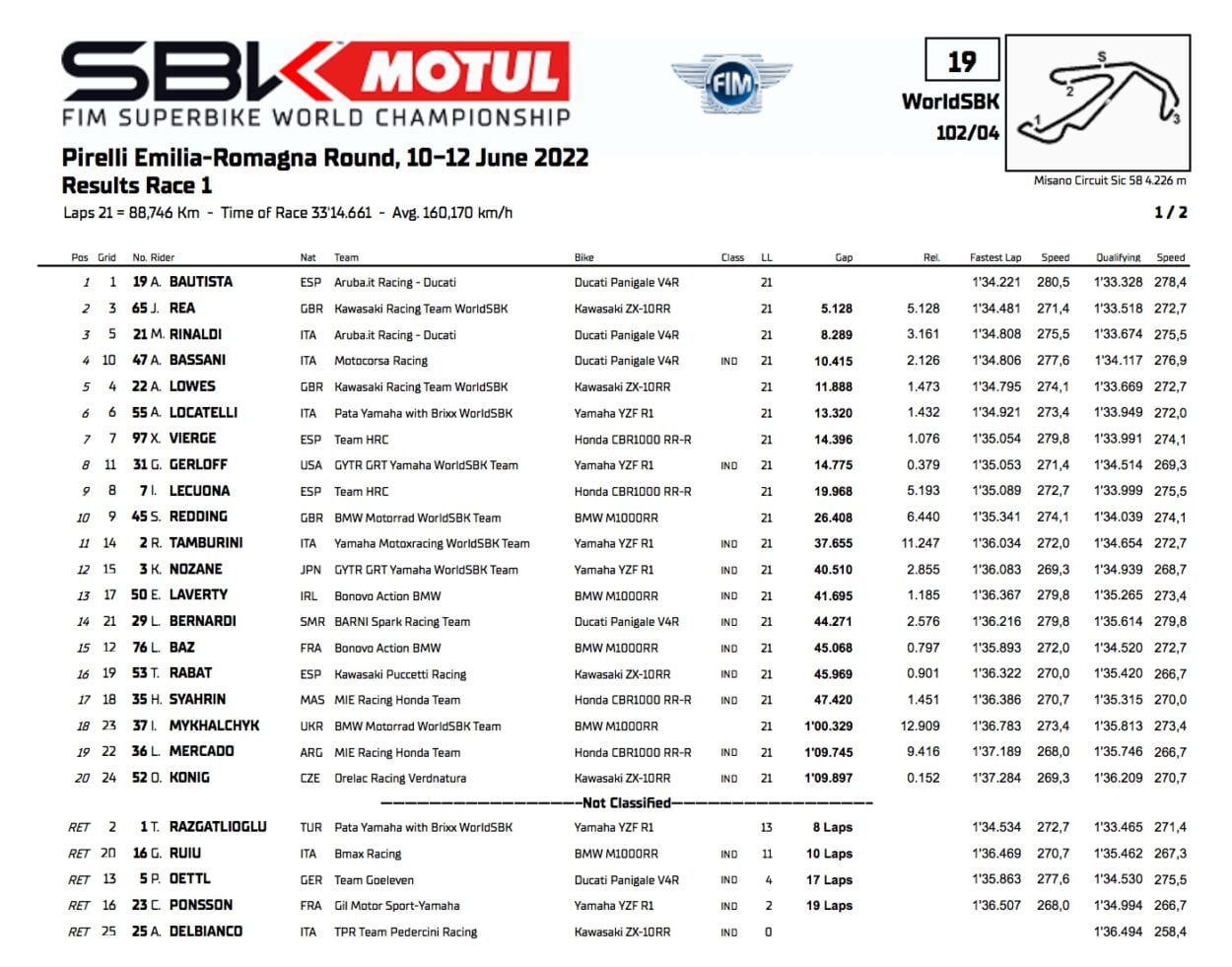 WSBK Misano : Classement de la Course 1