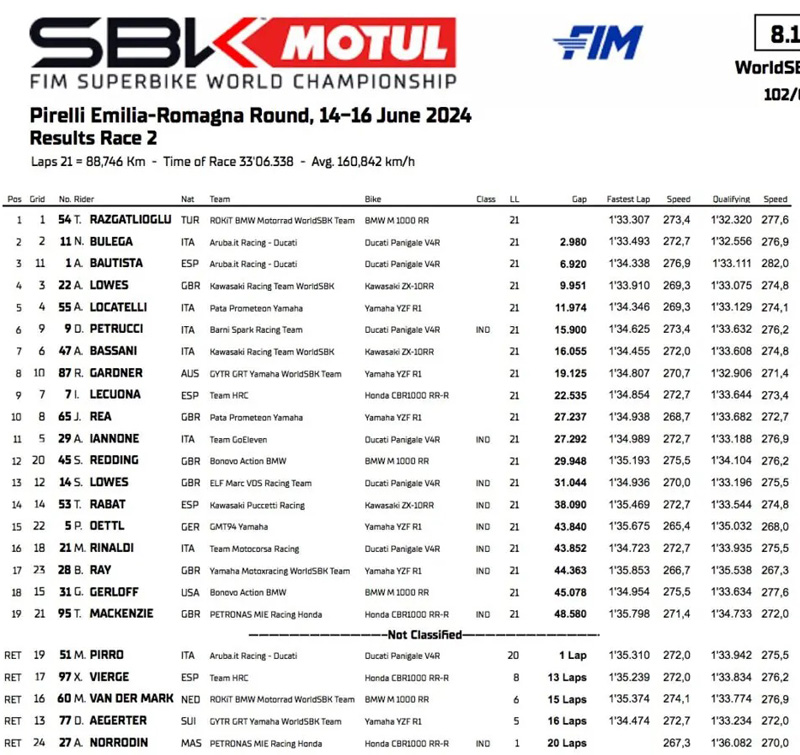 Classement de la course 2 des Superbike à Misano :