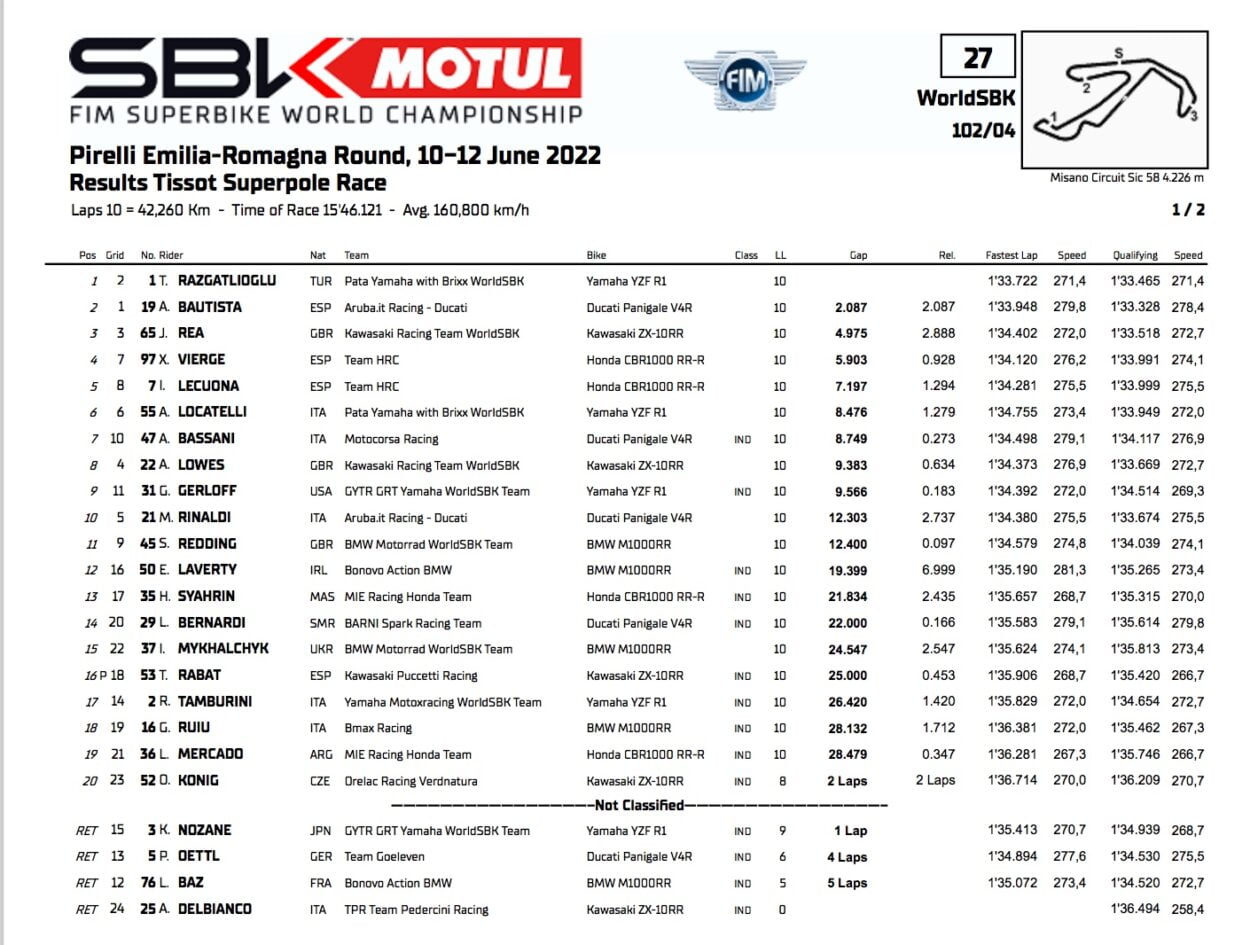 Enfin Yamaha remporte sa première victoire en 2022, avec un Toprak Razgatlioglu déterminé à saisir tout ce qui lui avait échappé ces derniers temps, à commencer par l’abandon hier à cause de problèmes électriques, sans oublier la victoire évanouie à Estoril, toujours au sprint, à cause des bavures du dernier tour. Toprak Razgatlioglu a concouru en solitaire : derrière l’habituel Alvaro Bautista a de nouveau réussi à devancer Jonathan Rea, relégué à la troisième place.