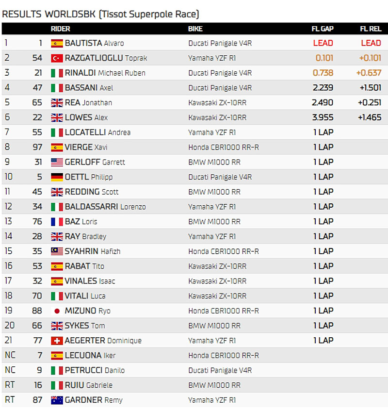 Résultats de la Course Superpole des WorldSBK Superbike à Misano :