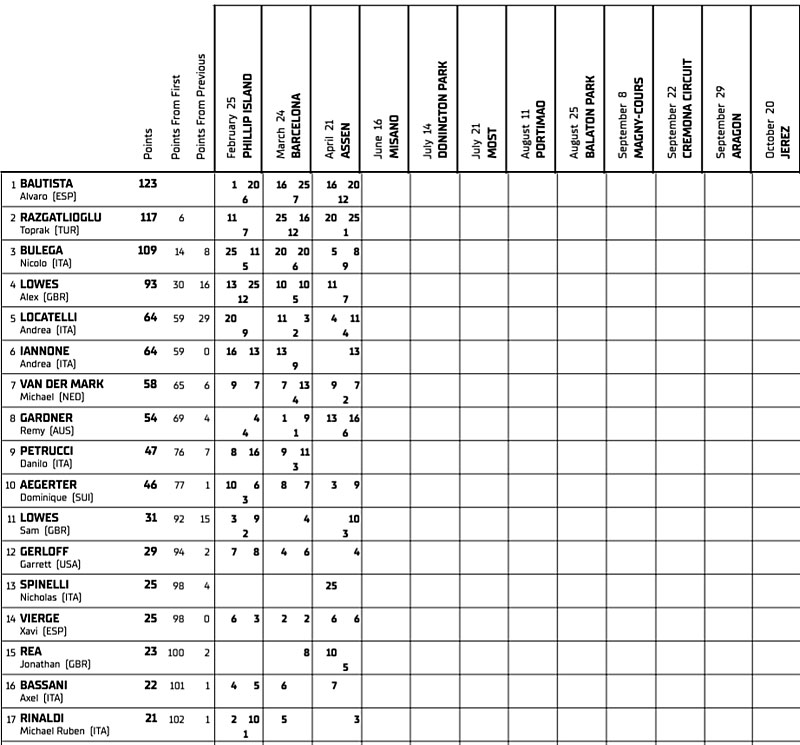 Après les trois premiers événements de la saison, le Champion du Monde en titre Alvaro Bautista mène le classement du championnat avec 6 points d’avance sur Toprak Razgatlioglu (BMW) et 14 points sur son coéquipier Nicolò Bulega. Ce sera un week-end particulièrement excitant pour le pilote né en 1999 à Montecchio dell’Emilia, qui a remporté le Championnat du Monde Supersport la saison dernière et a connu un début de saison passionnant sur la Ducati Panigale V4R.