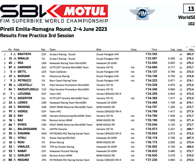 Résultats de la FP3 des WorldSBK Superbike à Misano :