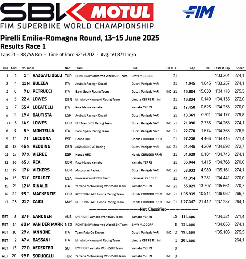 P1 – Toprak Razgatlioglu (ROKiT BMW Motorrad WorldSBK Team) : « Ce n’était pas une course facile, mais j’ai poussé à fond à chaque tour. Je savais que Bulega et Ducati seraient performants sur ce circuit et, avec la chaleur, ce n’était facile pour personne. Au cours des derniers tours, j’ai senti beaucoup de vibrations sur la moto, mais je suis resté concentré. Cette course était très importante pour moi et pour le championnat. Nous sommes toujours en lice pour le titre en WorldSBK et je suis heureux d’avoir remporté la course 1, mais il nous reste encore deux courses ce week-end. »
