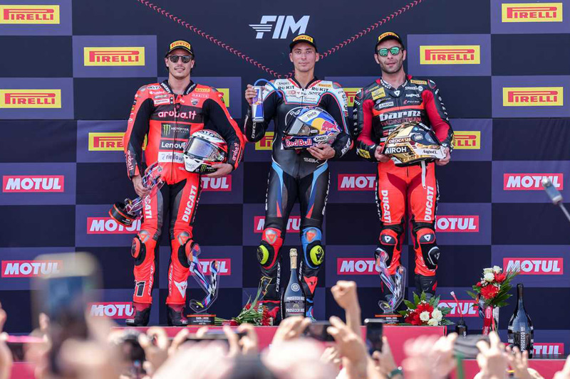 Parti en pole, Toprak Razgatlioglu a commis une erreur dans le virage 8 du premier tour et est sorti de la piste avant de retomber à la troisième place à la fin du tour. En l’espace d’un tour, il a profité d’une chute d’Axel Bassani dans le virage 6 pour se lancer à la poursuite de Nicolo Bulega. Le pilote Ducati a pris le virage 9 trop large au cinquième tour, laissant la porte ouverte à Toprak Razgatlioglu qui a pris la tête avant le quart de la course pour ne plus la quitter, malgré la pression de la Ducati #11 revenue dans son sillage à l’entame du dernier quart.