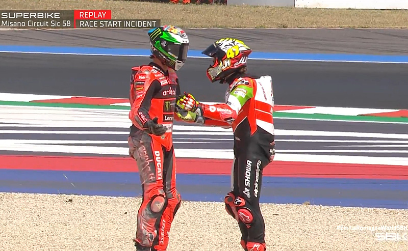 Lors de la course Superpole de la sixième manche du Championnat du monde Superbike à Misano, un incident est survenu au premier freinage du tour entre Axel Bassani et Nicolo Bulega, avec pour résultat l’abandon des deux pilotes.