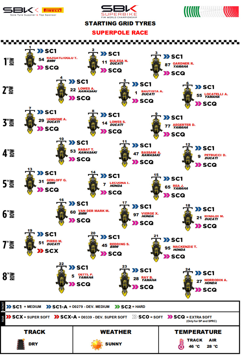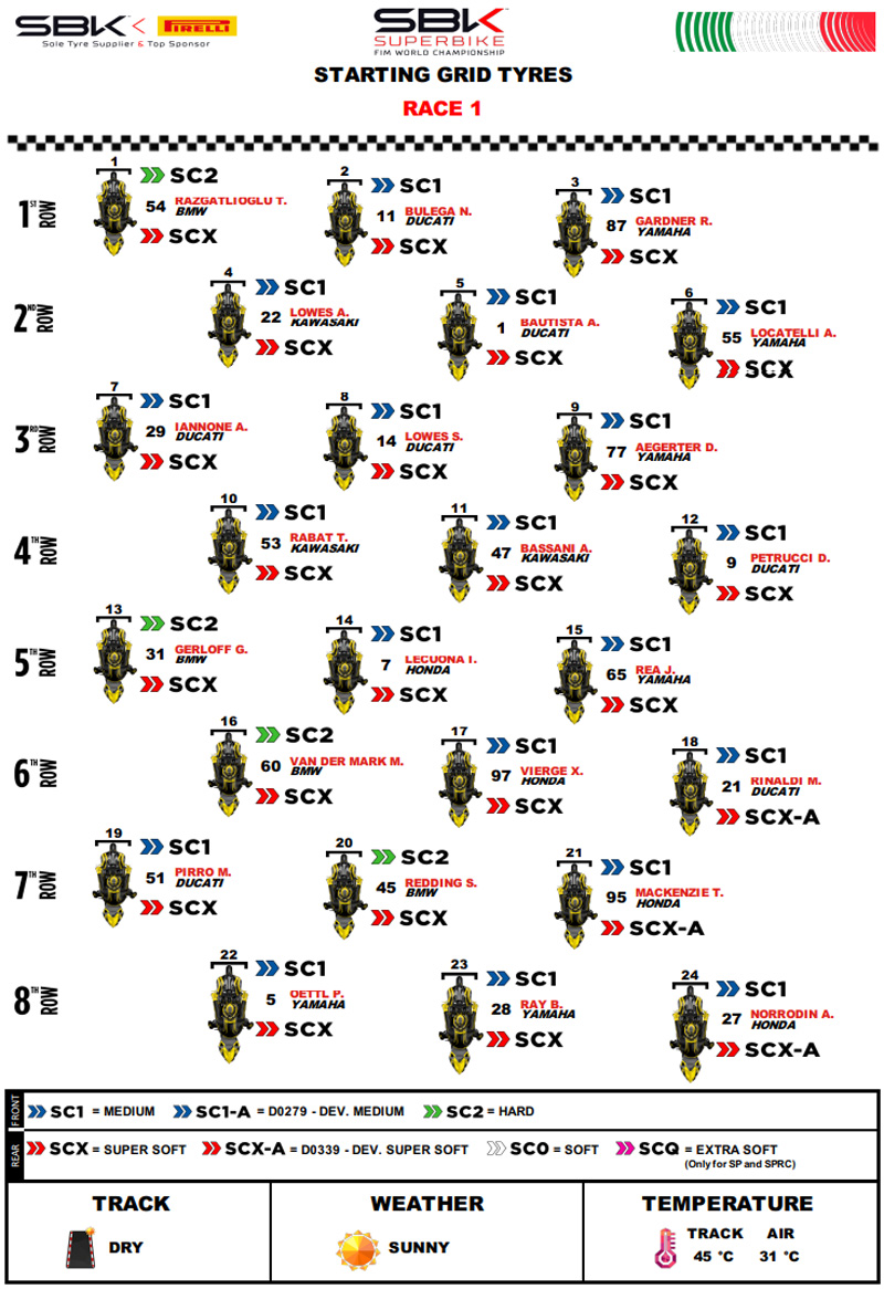 – Le poleman Toprak Razgatlioğlu (BMW), avec la combinaison SC1 à l’avant et SCQ à l’arrière, a pris la première place sur la grille avec un temps de 1’32.320, un nouveau record de piste pour la catégorie qui bat le précédent établi par Álvaro Bautista en 2023 de près de 7 dixièmes de seconde.