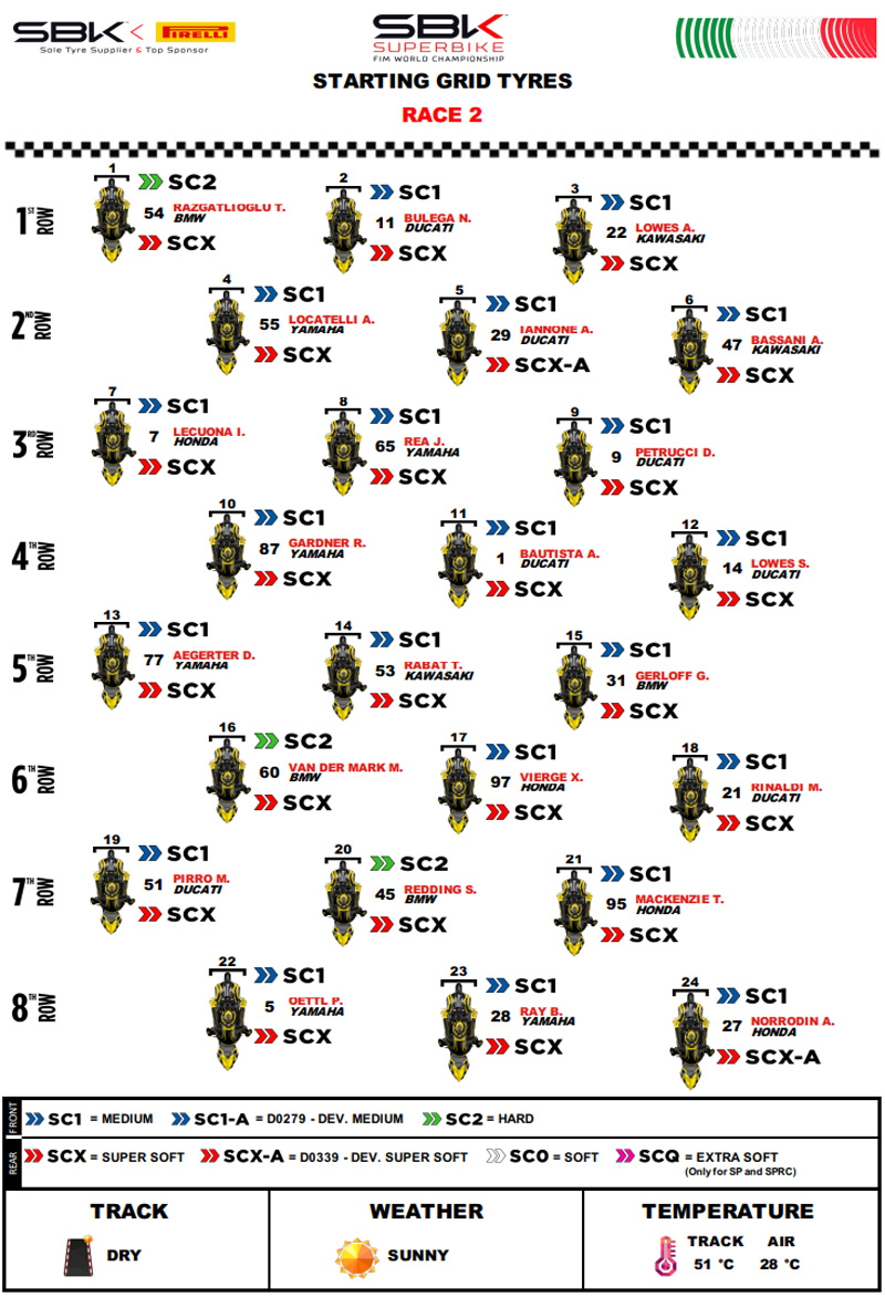 – Dans la course 1 du WorldSBK, presque tous les pilotes ont choisi le SCX standard pour l’arrière, avec Rinaldi (Ducati), Mackenzie (Honda) et Norrodin (Honda) sur le pneu de développement SCX-A dans la spécification D0339. À l’avant, le choix a été quasi unanime pour le SC1 standard, à l’exception des pilotes BMW (Razgatlioğlu, Gerloff, van der Mark, et Redding) avec le SC2.