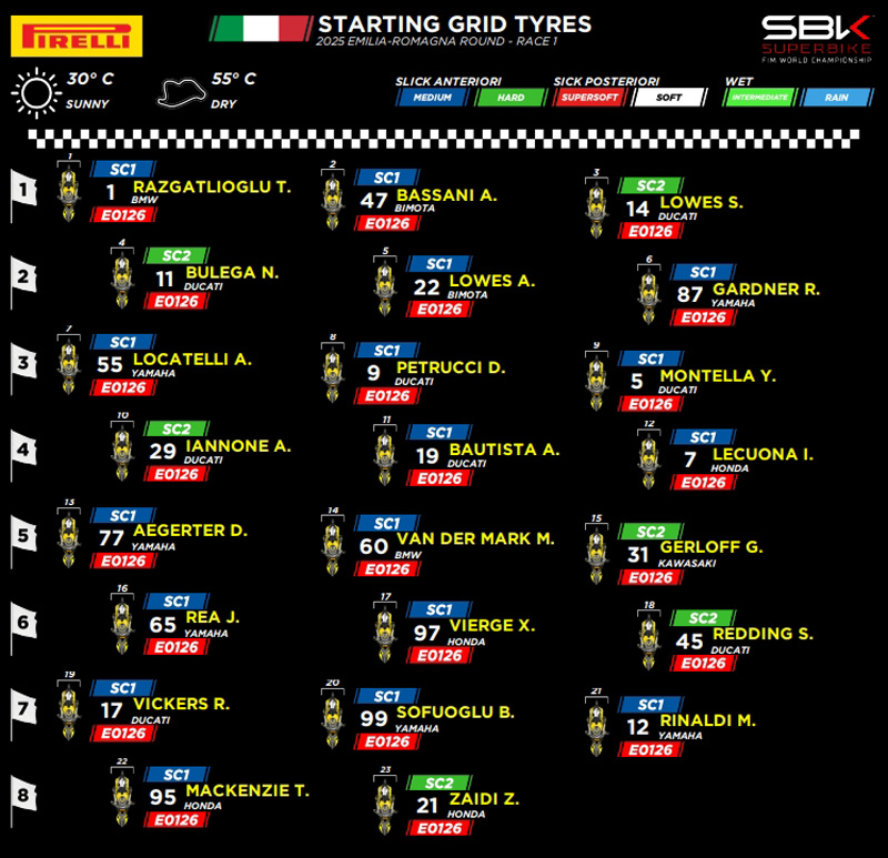La première victoire du week-end lors de la manche Pirelli Emilia-Romagna du championnat du monde FIM Superbike est revenue à Toprak Razgatlioğlu (BMW), qui s’est imposé dans la course 1 devant Nicolò Bulega (Ducati), deuxième à l’arrivée et seul pilote à avoir réussi à suivre le rythme du pilote turc, et Danilo Petrucci (Ducati), troisième. Choix de pneus identique pour le premier et le troisième classés : SC1 combiné avec le nouveau pneu arrière supersoft E0126 en cours de développement. Bulega, quant à lui, a opté pour le SC2 à l’avant.
