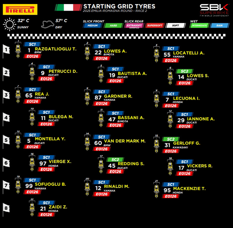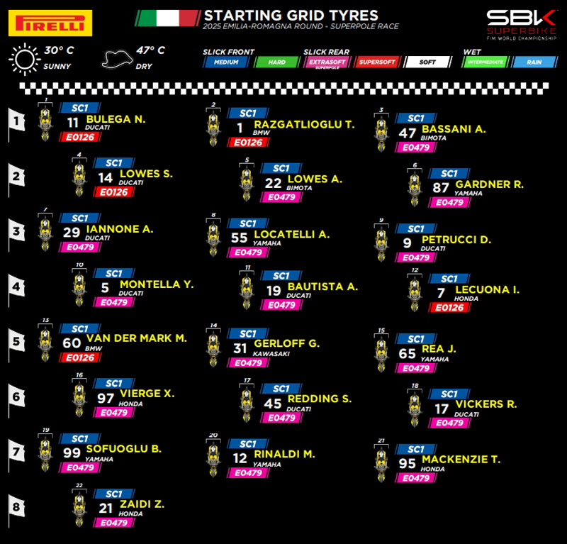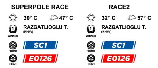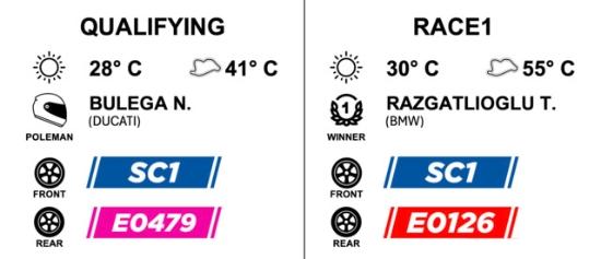 Dans la Superpole Race, la plupart des pilotes ont utilisé le nouveau pneu arrière extra-tendre E0479 en développement. À part Razgatlioğlu, les seuls à avoir choisi le pneu super-tendre E0126 pour la course courte étaient le poleman Nicolò Bulega, Sam Lowes, Iker Lecuona (Honda) et Michael Van Der Mark (BMW). À l’avant, le pneu standard SC1 était la référence dans les deux courses.