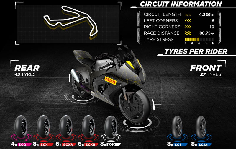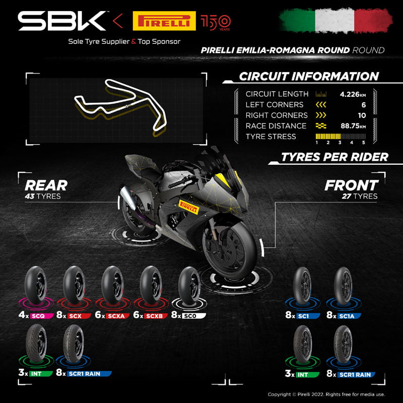 En Superbike, trois options de Pirelli SCX arrière seront disponibles pour la manche du WorldSBK à Misano dont le manufacturier italien est le sponsor-titre. En plus des pneus standard SCQ, SC0 et SCX, l’allocation arrière est complétée par deux nouvelles options de développement en composés supersoft.