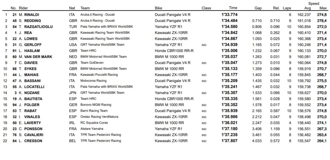 Alex Lowes et Garrett Gerloff, s’emparent quant à eux des cinquième et sixième places, devant la première Honda de Leon Haslam et Michael van der Mark. Le top 10 est complété par Chaz Davies et Tom Sykes, alors que Lucas Mahias a manqué de peu une place parmi les dix pilotes les plus rapides.