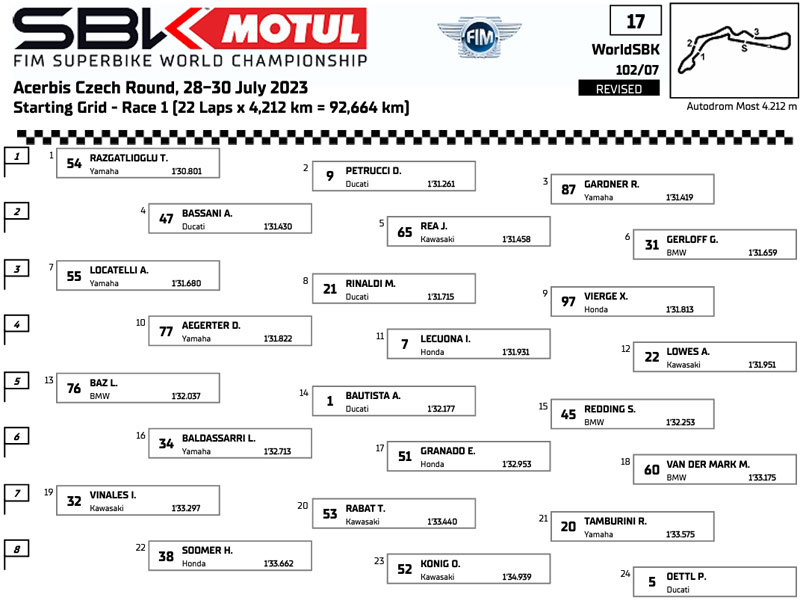 Le pilote de pointe de Yamaha s’élancera aux côtés de Danilo Petrucci (Barni Spark Racing Team) et Remy Gardner (GYTR GRT Yamaha WorldSBK Team), alors que la deuxième ligne est composée de Axel Bassani (Motocorsa Racing) auteur d’un meilleur tour annulé, Jonathan Rea et Garrett Gerloff (Bonovo Action BMW).