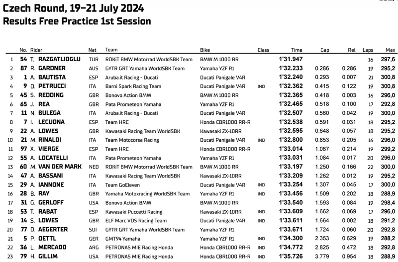 Comme prévu, le duo turco-allemand Toprak Razgatlioglu / BMW s’impose d’emblée sur le circuit tchèque de Most lors de la FP1 des WorldSBK Superbike. Quelque chose changera-t-il d’ici dimanche ?