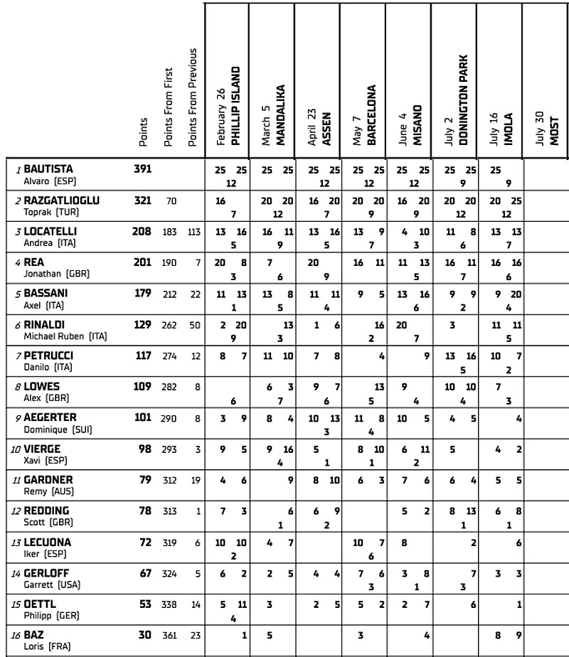 Derrière ces deux hommes qui se battent pour le titre, Andrea Locatelli (Pata Yamaha Prometeon WorldSBK) se défend bien face à la pression de Jonathan Rea (Kawasaki Racing Team WorldSBK), ne concédant que 5 points en Italie, au bénéfice du Nord-Irlandais au guidon de sa Kawasaki pourtant volontairement bridée par son équipe. Ce dernier offrira-t-il sa première victoire à Kawasaki en République Tchèque alors qu’il fait par ailleurs l’objet d’une rumeur le voyant passer dans les troupes d’Iwata l’an prochain ?