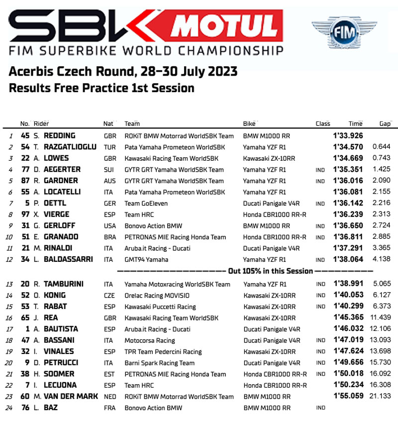 Ce vendredi matin, c’est donc une piste encore humide de la pluie nocturne avec des températures de 19° dans l’air et 23° au sol qui accueille les 24 pilotes Superbike pour cette FP1 de 45 minutes, alors que l’Estonien Hannes Soomer remplace Hafizh Syahrin chez MIE Petronas.