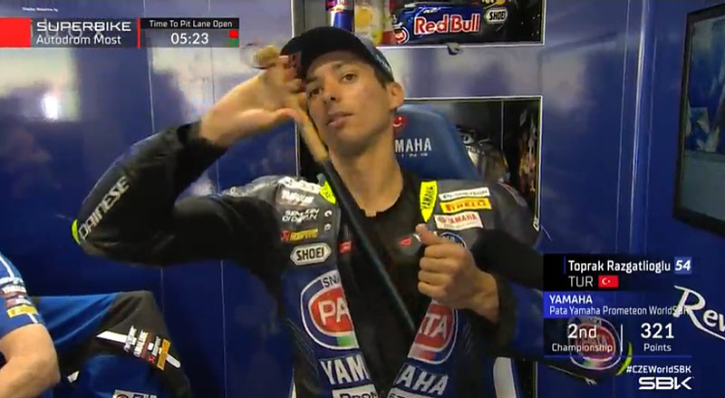 Petite note d’humour, avant même le début de la séance, Toprak Razgatlioğlu apparaît avec une batte de base-ball dans sa combinaison…