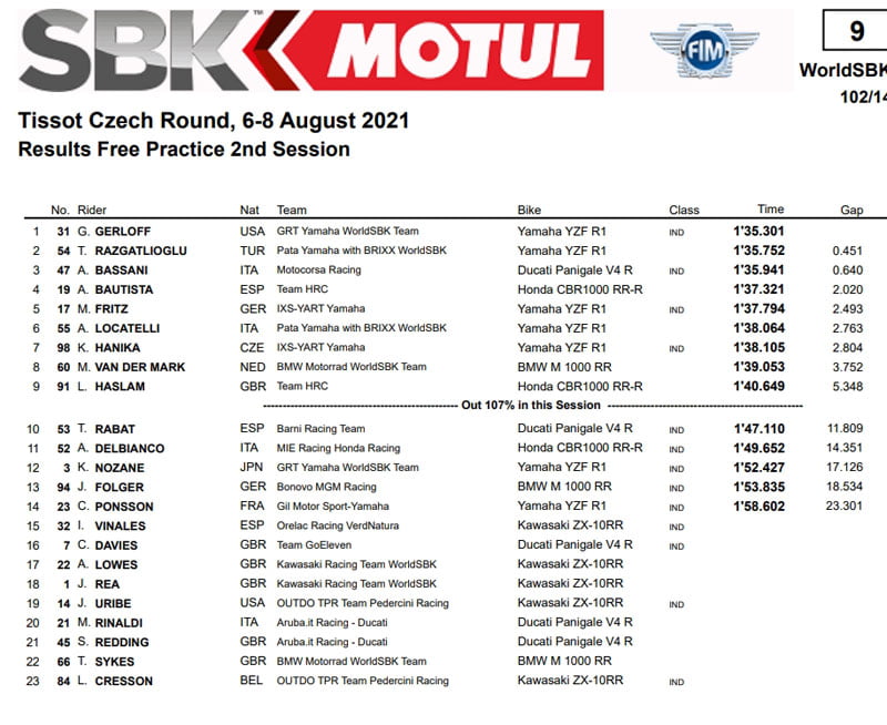Le mauvais temps gâche la deuxième séance, qui aurait été nécessaire pour mieux connaître le nouveau tracé de Most en Superbike. Course 1 avec beaucoup d’inconnues…