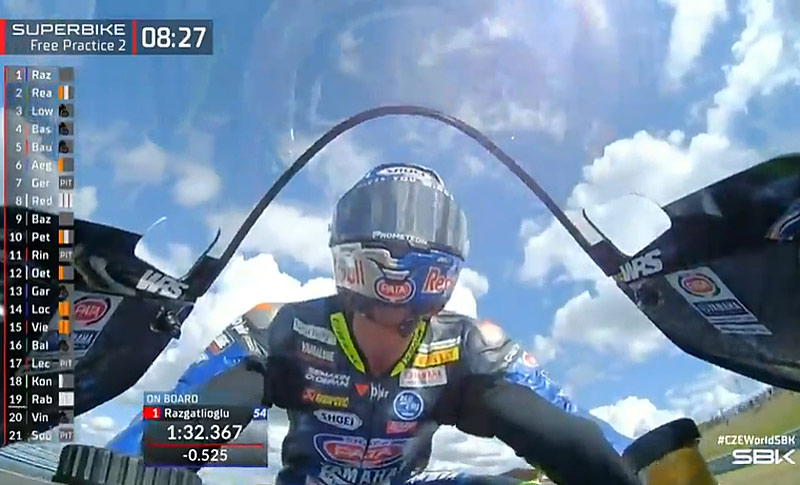 À l’issue du premier tour, déjà plus rapide que ce matin, c’est Alex Lowes qui prend le commandement en 1’33.425 devant Scott Redding, Jonathan Rea, Alex Bassani et Toprak Razgatlioğlu tandis que Michael Van Der Mark chute sans gravité mais doit abandonner sa BMW endommagée.