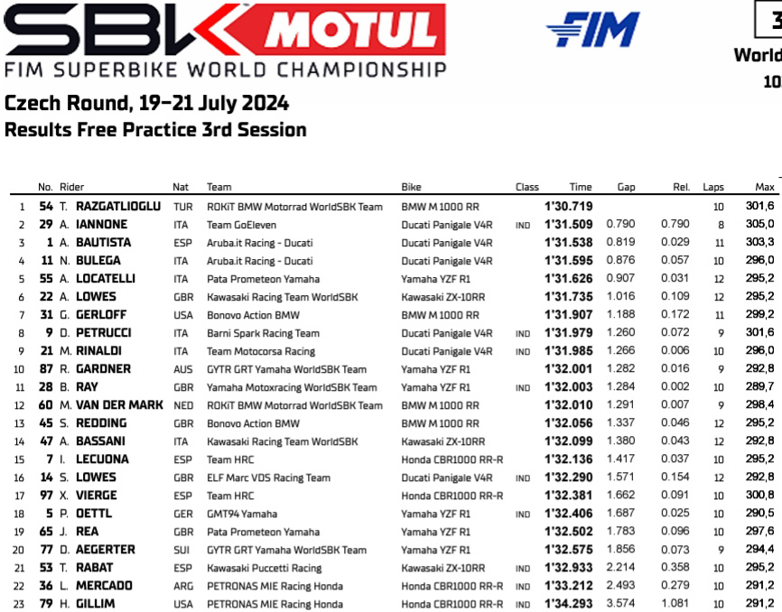 Lors du dernier run, l’as de BMW a monté l’arrière le plus tendre, montrant une séquence phénoménale. Immédiatement le record, qui abaisse la référence de la Superpole 2023, que Toprak Razgatlioglu avait lui-même réalisée avec la Yamaha. Puis, après un tour calme, trois autres attaques : 1’30″9 et deux fois 1’31″1. En d’autres termes, dans le dernier run, Toprak a bouclé quatre tours plus vite que le meilleur temps de n’importe quel autre pilote, et ce n’est pas peu dire ! Si l’on met de côté la question de la durée de vie des pneus, il est facile de prédire un nouveau triplé.