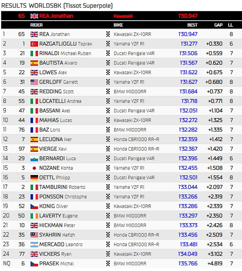 Razgatlioğlu, Rea, Redding, Rinaldi, Bautista, Lowes, Locatelli, Mahias, Lecuona et Gerloff constituent alors le top 10. Loris Baz est 11e.