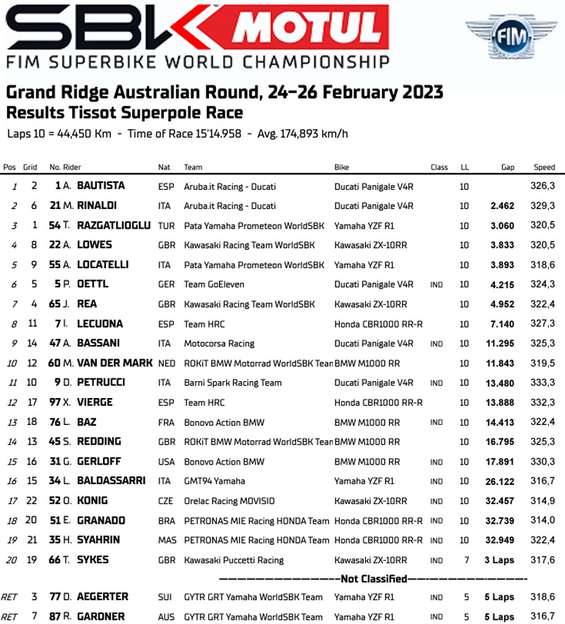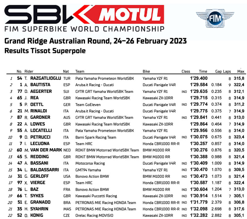 Pourtant, ils sont nombreux à ne pas avoir démérité, à commencer par Andrea Locatelli (Pata Yamaha Prometeon WorldSBK) en FP1, Michael Ruben Rinaldi (Aruba.it Racing – Ducati) et Philipp Öttl (Team GoEleven) en FP2, Iker Lecuona (Team HRC) en FP3 ou Dominique Aegerter (GYTR GRT Yamaha WorldSBK Team) en Superpole, mais la pluie australe a su calmer leurs velléités, ne laissant que le célèbre trio émerger des eaux.