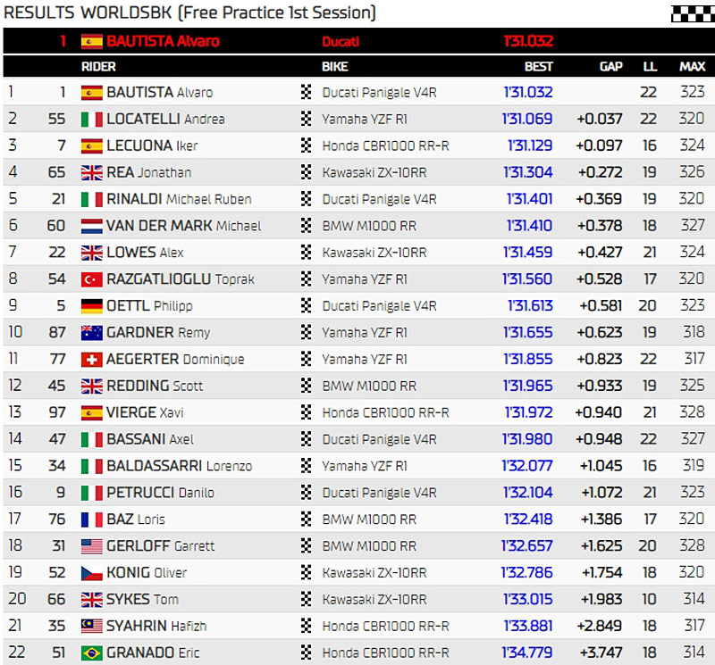 Après ce premier tour très rapide, puisqu’à moins d’une seconde du meilleur temps du test officiel, les chronos n’évoluent guère en haut du tableau, même si Andrea Locatelli parvient à s’emparer de la deuxième place provisoire, du moins jusqu’à ce que Álvaro Bautista ne la ravisse lors de son deuxième tour lancé.