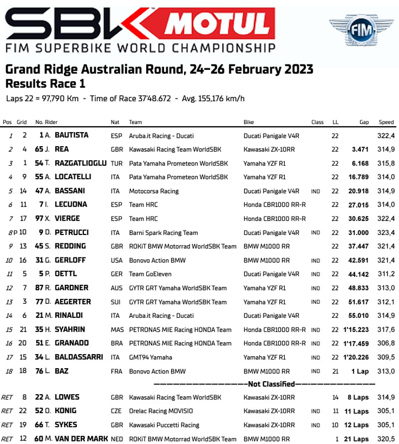 Après des essais libres ayant dispersé les membres du Trio Titanesque dans les classements provisoires, la Superpole qualificative en a réuni deux en haut du tableau avant les retrouvailles habituelles lors de la Course 1. Ainsi, malgré le chaud, le très chaud, les courtes averses puis une piste du circuit de Phillip Island détrempée, Álvaro Bautista (Aruba.it Racing – Ducati), Jonathan Rea (Kawasaki Racing Team WorldSBK) et Toprak Razgatlioğlu (Pata Yamaha Prometeon WorldSBK) ont peu en découdre entre eux avant de monter sur le podium australien dans un ordre rouge-vert-bleu.