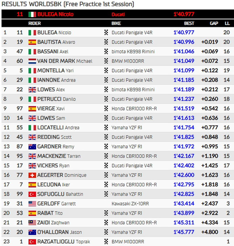 Résultats de la FP1 WorldSBK Superbike à Portimao :