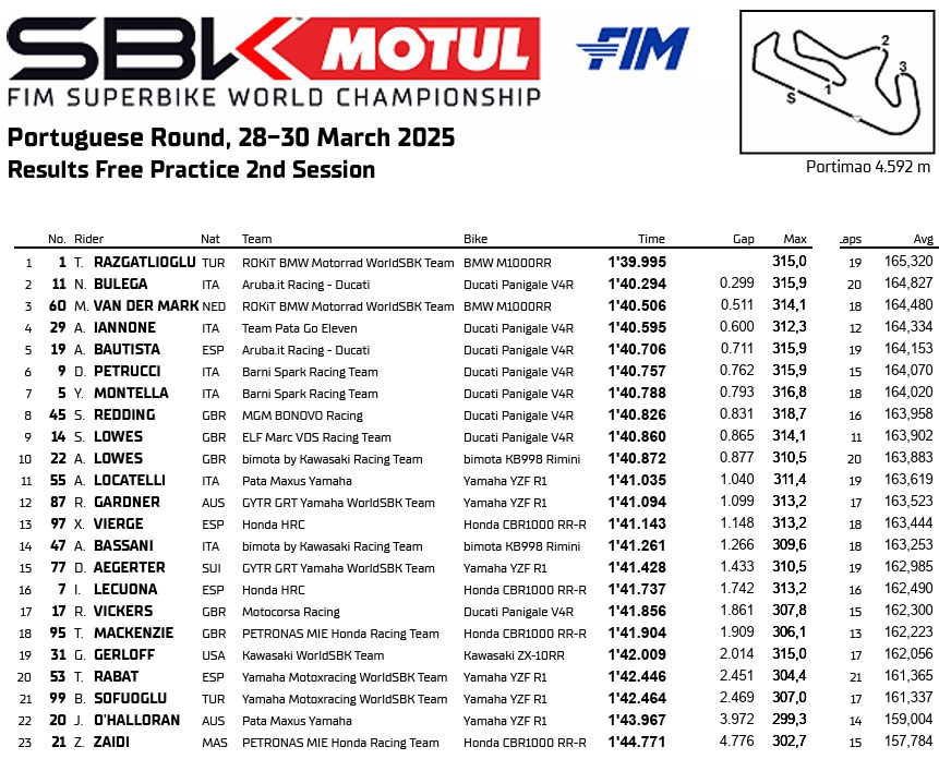 Cette fois-ci, les Ducati ont dû suivre les deux BMW. Andrea Iannone a réalisé le quatrième temps devant pas moins de cinq de ses coéquipiers. L’ancien pilote de MotoGP a un bon rythme, ce qui permet de penser au podium. Pour rester avec les deux autres, il faudra que l’équipe Go Eleven trouve les 2-3 dixièmes manquants. Andrea Iannone a également chuté à basse vitesse, rentrant au box sur sa moto. Alvaro Bautista, cinquième temps, est également à l’affût : sur les montées et descentes lusitaniennes, il a souvent fait parler de lui, mais avec un Bulega désormais lancé, les nouvelles hiérarchies dans le box Ducati semblent marquées.