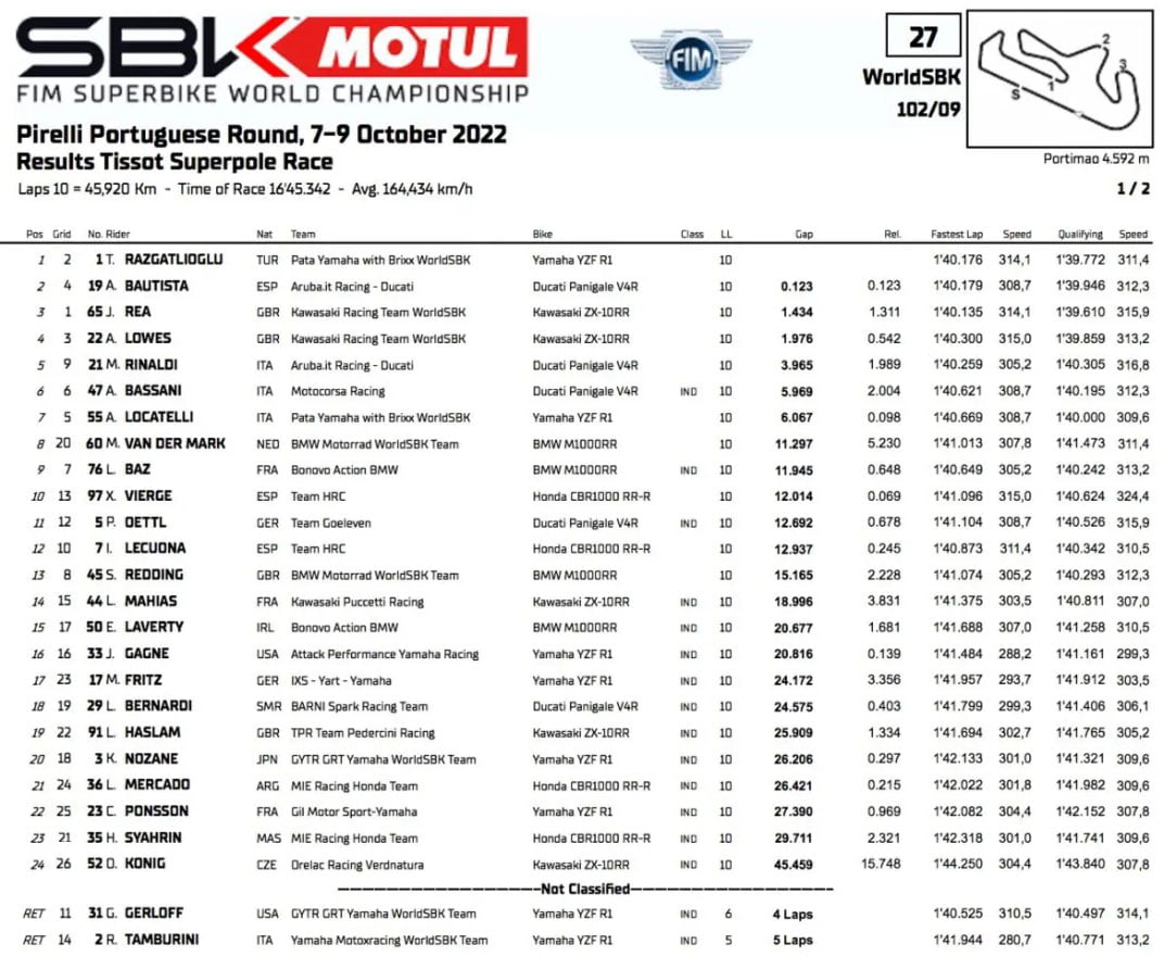 Résultats de la Course Superpole des WorldSBK Superbike à Portimão :
