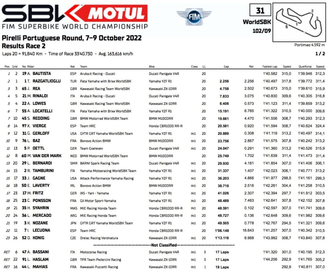 Résultats de la Course 2 des WorldSBK Superbike à Portimão :