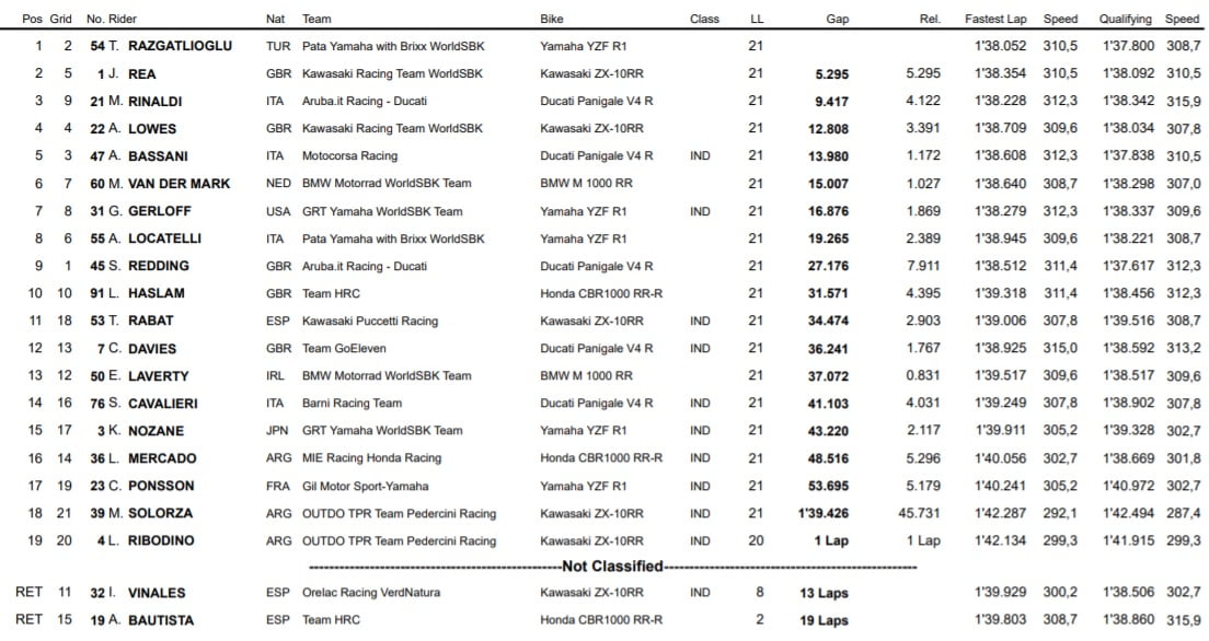 A l’instar de la catégorie Supersport quelques instants plus tôt, le Superbike a offert un cavalier en solitaire de la part de son vainqueur, en la personne de Toprak Razgatlıoğlu. Le pilote turc, qui avait dominé l’intégralité des séances d’essais libres plus tôt dans le weekend, avait dû plier en qualifications face à un surprenant Scott Redding, auteur de sa première Superpole de la saison.