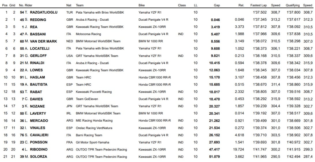 Derrière Razgatlıoğlu et Redding, Rea a bouclé cette Course Superpole en solitaire à la troisième place, devant Axel Bassani, auteur d’une très belle prestation. Le Transalpin a en effet réussi à se défaire d’Alex Lowes dans le troisième tour et à conserver sa quatrième place jusqu’au drapeau à damier.
