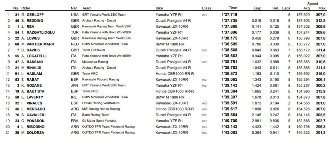 Razgatlıoğlu quatrième, on retrouve ensuite Alex Lowes et Michael van der Mark. Chaz Davies fait quant à lui bonne figure en septième position, devant les deux Italiens Andrea Locatelli et Axel Bassani, alors que Michael Ruben Rinaldi ferme le top 10.