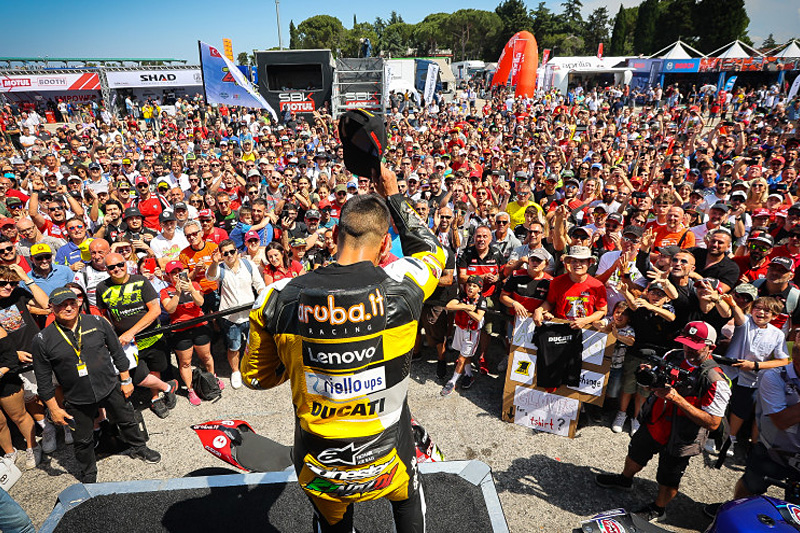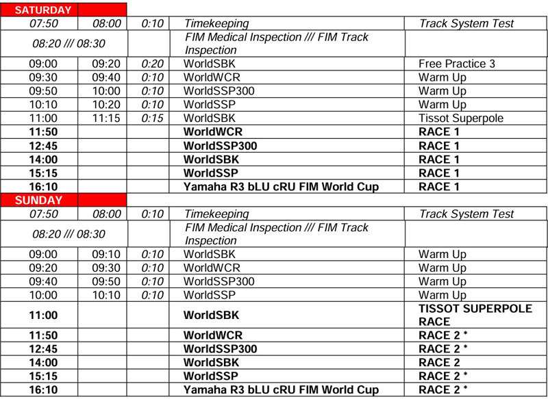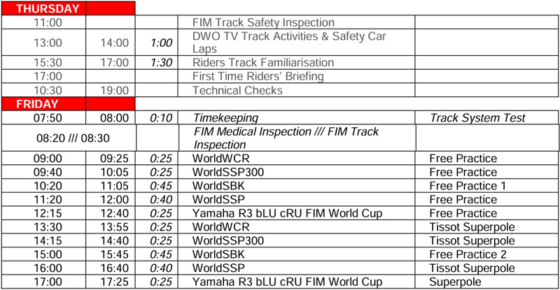 – Un nouvel horaire a été décidé (qui voit principalement les Superpoles WorldSSP, WorldSSP300 et la nouvelle catégorie WorldWCR déplacées au vendredi après-midi, ainsi que la troisième séance d’essais libres des Superbike passer de 30 à 20 minutes, et le Warm Up du dimanche de 15 à 10 minutes) :