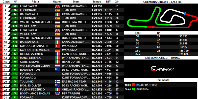 En Supersport, en l’absence des deux leaders du championnats, les chronos ont continué de descendre, Bahattin Sofuoglu (MV Agusta Reparto Corse) mettant à mal la référence en 1’32.579 inscrite la veille par Yari Montella avec la Ducati V2 du Barni Spark Racing Team. Le numéro 54 a inscrit 1’31.866 devant son coéquipier Marcel Schröetter et Valentin Debise (Evan Bros. WorldSSP Yamaha Team) également en amélioration.