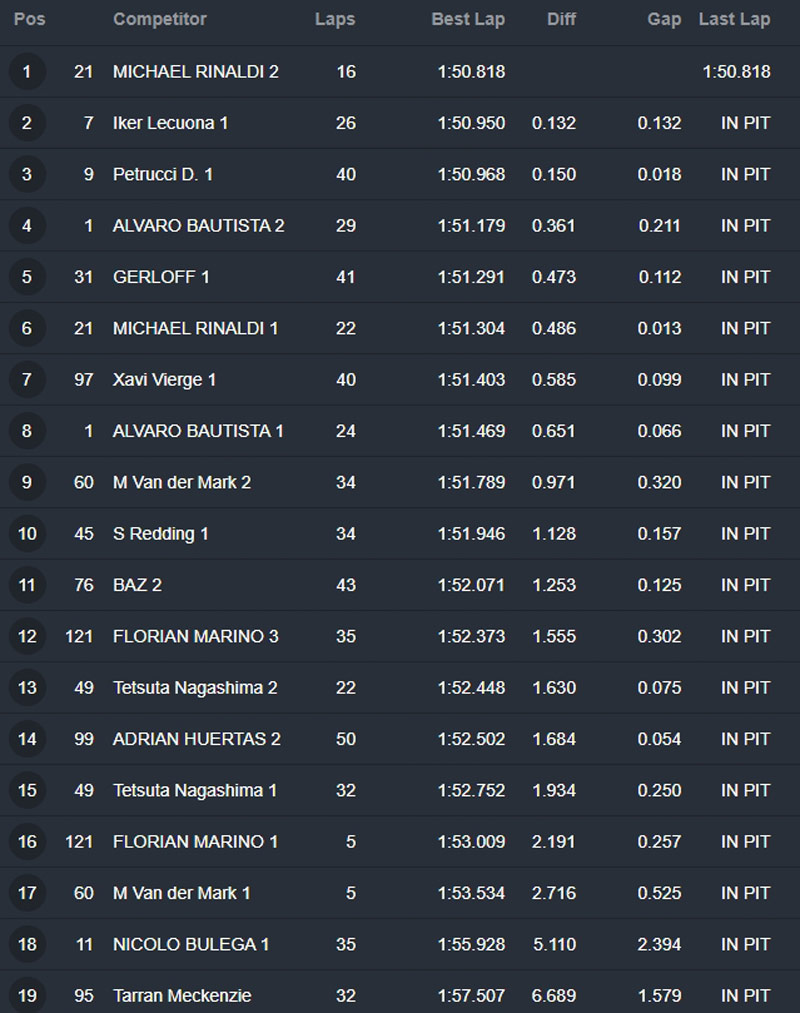 Un peu avant 13 heures, alors que l’air atteignait tout juste 20° et la piste 35°, Iker Lecuona et Danilo Petrucci brisaient la barre des 1’51, en 1’50.950 pour le premier, 1’50.968 pour le deuxième.