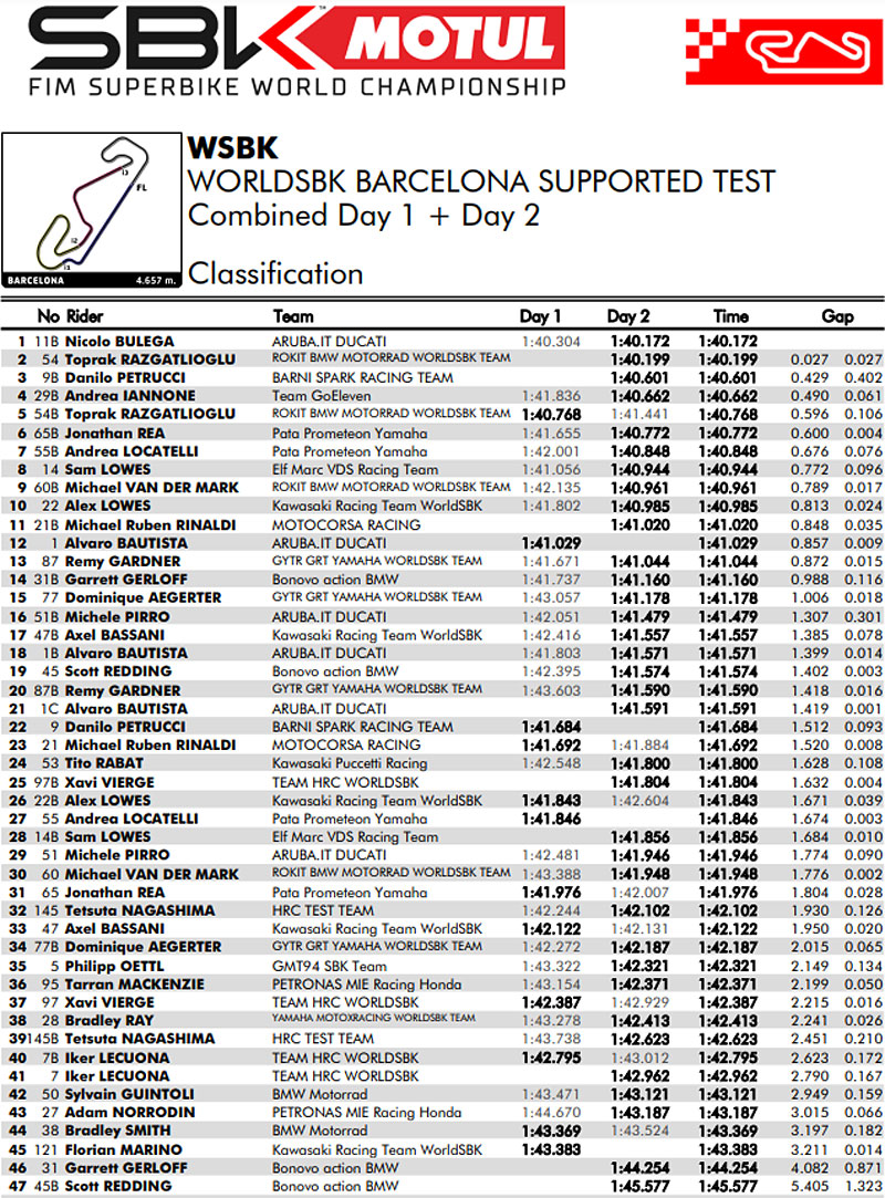 Il a aussi révélé les nombreux nouveaux composants testés par BMW : « pour le dernier run, j’ai repris l’ancien bras oscillant mais avec un amortisseur différent et de nouvelles fourches à l’avant. On a testé pas mal de choses. Entre l’ancien et le nouveau bras oscillant, la différence est minime, mais je préfère l’ancien. Cela dit, c’est peut-être juste psychologique. Je n’ai jamais gagné à Barcelone, bien que ce soit un de mes rêves. L’adhérence a toujours été un problème ici, donc on va devoir travailler sur les pneus. »