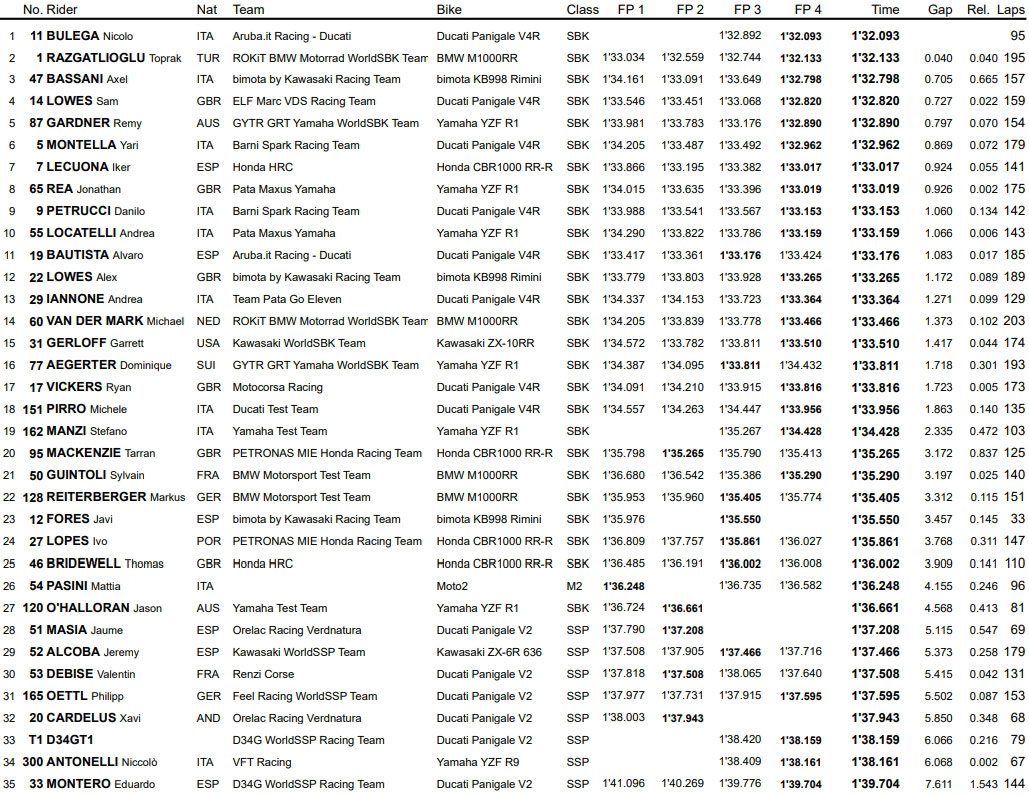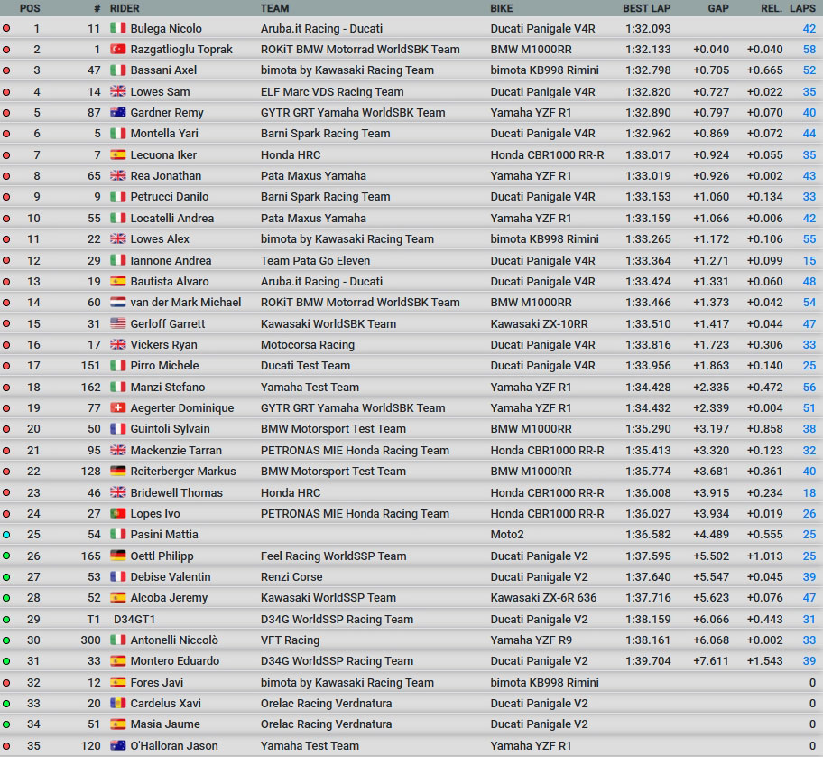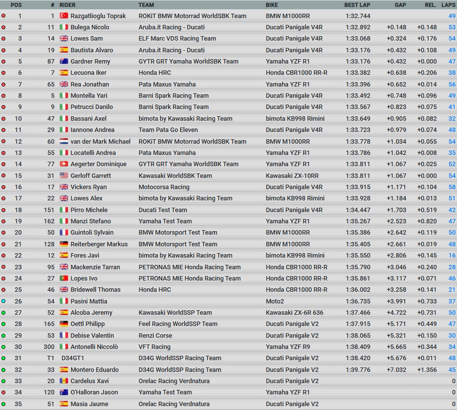 Sam Lowes (ELF Marc VDS Racing Team), Remy Gardner (GYTR GRT Yamaha WorldSBK Team) suivent, ce dernier plaçant la Yamaha dans une position intéressante, alors que Jonathan Rea (Pata Maxus Yamaha) semble se réacclimater plutôt vite…