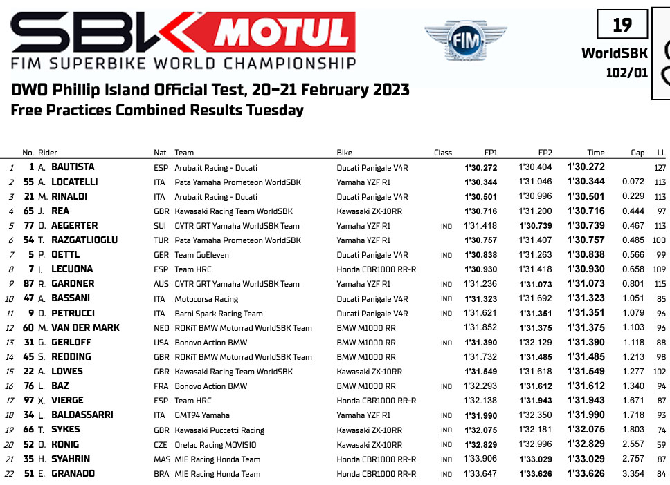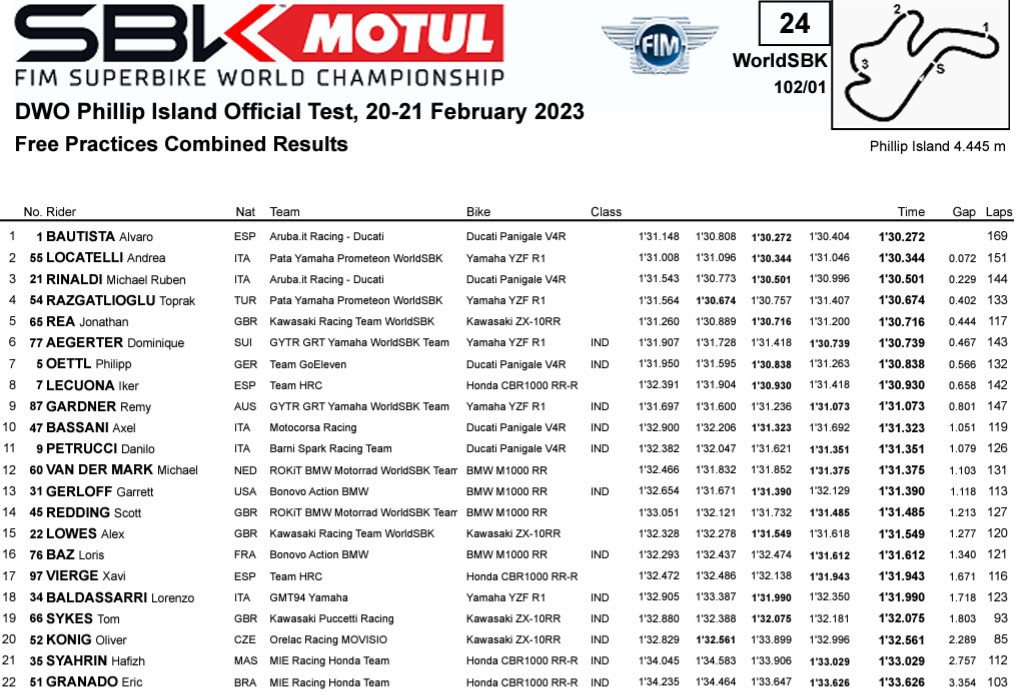 Résultats combinés WSBK Superbike Test Phillip Island :