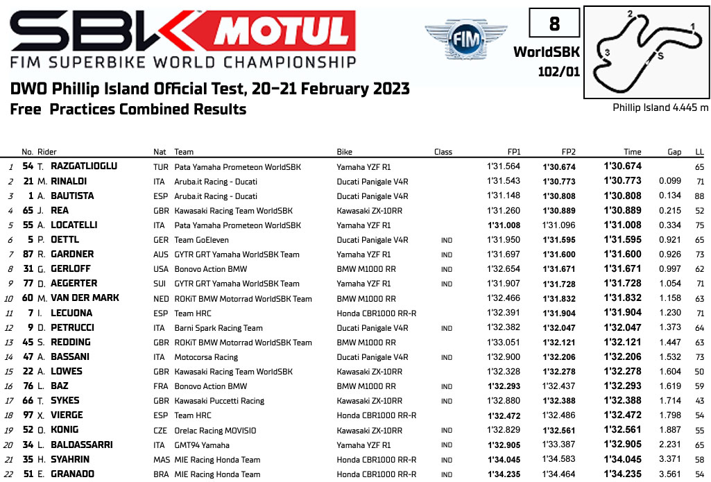 Classement combiné WSBK Superbike Test Phillip Island J1 :