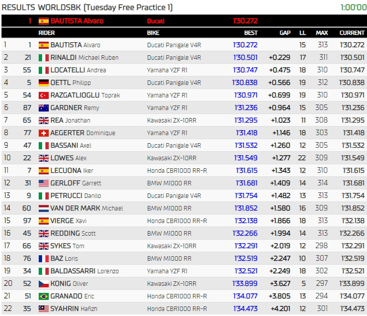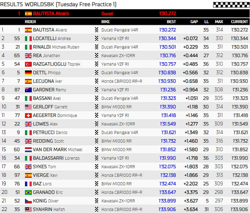 Michael Ruben Rinaldi fait un premier run très court, 6 tours, puis repart et inscrit 1’30.501, soit le meilleur temps provisoire des essais. A l’issue de le première demi-heure, il précède Andrea Locatelli, Álvaro Bautista, Philipp Öttl, Toprak Razgatlioğlu et Jonathan Rea qui est à une seconde.