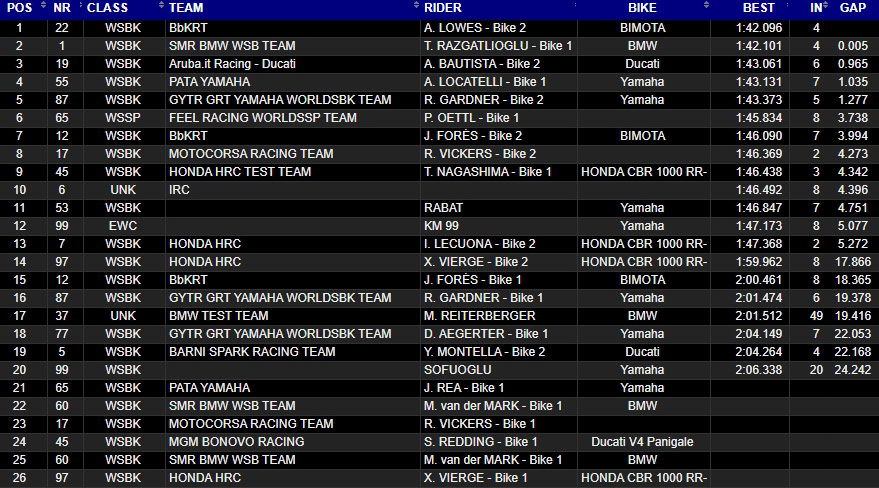 Alvaro Bautista et Nicolò Bulega ont été contraints de ne rouler que lors de la séance de l’après-midi du 1er jour. Parallèlement, le deuxième jour, l’activité sur piste sèche a été limitée à quelques minutes.