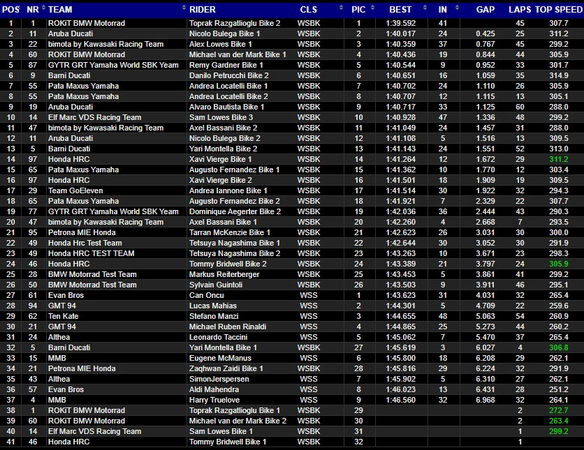 Danilo Petrucci a été très rapide les deux jours, le meilleur viatique possible quand ça compte vraiment. Samedi, le pilote Barni Ducati a été plus rapide qu’Alvaro Bautista, qui n’a fait qu’une demi-journée : Ducati doit avoir une longue liste d’innovations techniques à présenter dans les prochains mois, pour réduire le temps de piste de la sorte. Les Bimota ont relevé le niveau, avec le superlatif d’Alex Lowes sur le tour chrono : troisième temps, non loin de la première Ducati.