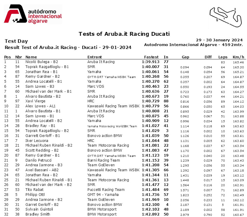 La surprise du jour est signée Sam Lowes, une autre des nouveautés du Superbike 2024. L’ancien protagoniste du Moto2 a déjà testé la Panigale V4 R (et les pneus Pirelli), ce qui lui a permis d’être deux dixièmes plus rapide qu’un certain… Alvaro Bautista. Cependant, le Britannique a chuté juste à la fin, pilote OK. L’Espagnol, lui, n’est jamais à la recherche du tour sensationnel, il a déjà en tête les 22 tours du double défi de Phillip Island. A Jerez, il avait terminé 16ème au classement général, mais son meilleur relais avait été l’un des meilleurs (analyse ici). Andrea Iannone est également derrière au classement, mais il y a une explication :  il n’avait jamais piloté une moto de course à Portimao avant aujourd’hui, même s’il s’était testé il y a quelques semaines avec une Ducati de route. Il n’est donc pas surprenant de le voir 1,2 seconde derrière Bulega. Le natif des Abruzzes est précédé par Danilo Petrucci.