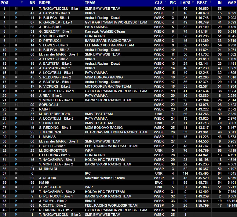 Sam Lowes sur Ducati Panigale V4 R et Michael van der Mark sur BMW ont complété le top 10. Álvaro Bautista, pilote du team Aruba Ducati, s’est classé douzième (+1.491) avec un nouvel échappement, devancé par Alex Lowes sur Bimota.