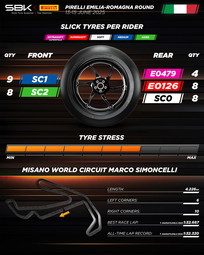 · Le week-end prochain, le championnat du monde FIM Superbike fera étape au circuit Misano World Circuit Marco Simoncelli à Misano Adriatico pour la sixième manche, dont Pirelli est le sponsor principal, baptisée Pirelli Emilia-Romagna Round. À cette occasion, les pilotes de la catégorie WorldSBK disposeront de la nouvelle spécification arrière E0479 en version extrasoft, qui remplace le SCQ standard. L’allocation arrière est complétée par une autre solution développée, le pneu supersoft E0126 déjà vu en action à Assen et Cremona, où il a été très bien accueilli et a été l’option la plus utilisée pour les longues courses, et par le pneu standard soft SC0.