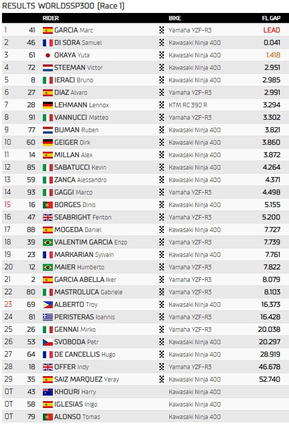 Manuel Di Sora : « Première ligne ce matin, deuxième place pour un rien, cela me rappelle beaucoup Assen (rires) mais je suis très heureux de cette course. Marc et moi avions un bon rythme et nous avons pu nous échapper, ce qui était le seul moyen de faire une course normale en Supersport 300. J’ai essayé de changer un peu ma stratégie pour le surprendre dans le dernier tour, mais on ne peut jamais savoir. Il a une moto puissante ce qui m’a fait perdre la course pour pas grand-chose. Nous essaierons à nouveau demain et je pense que nous sommes forts et que nous avons enfin trouvé la bonne direction. »