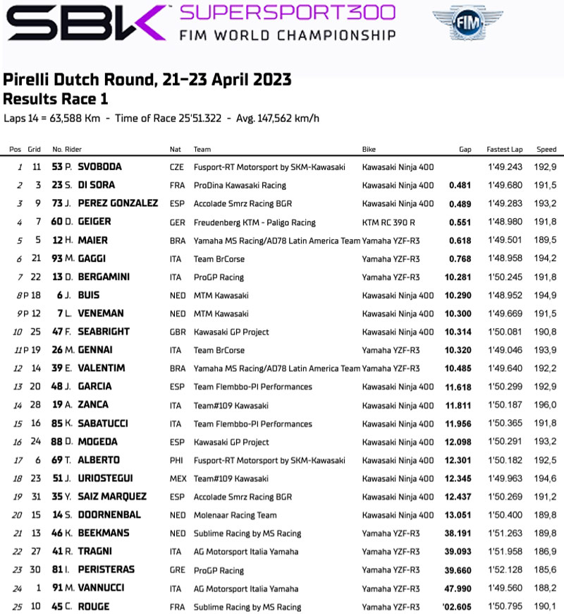 Faute de temps, nous ne reportons pas l’actualité des Supersport 300, mais nous tenons à saluer la 2e place de Samuel Di Sora dans la course 1 à Assen, où la catégorie légère faisait sa rentrée 2023 !